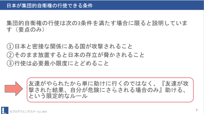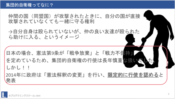 日本(日本国憲法)における集団的自衛権の扱いや、そのメリットやリスク、懸念点を学びました。